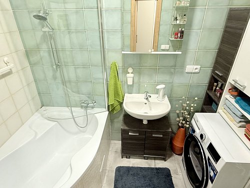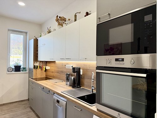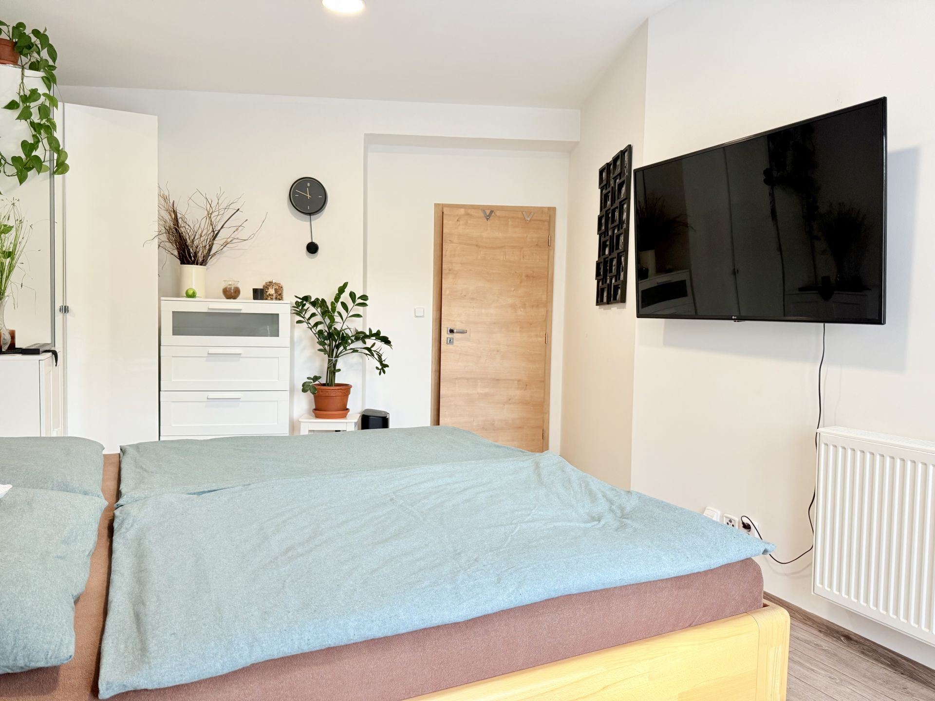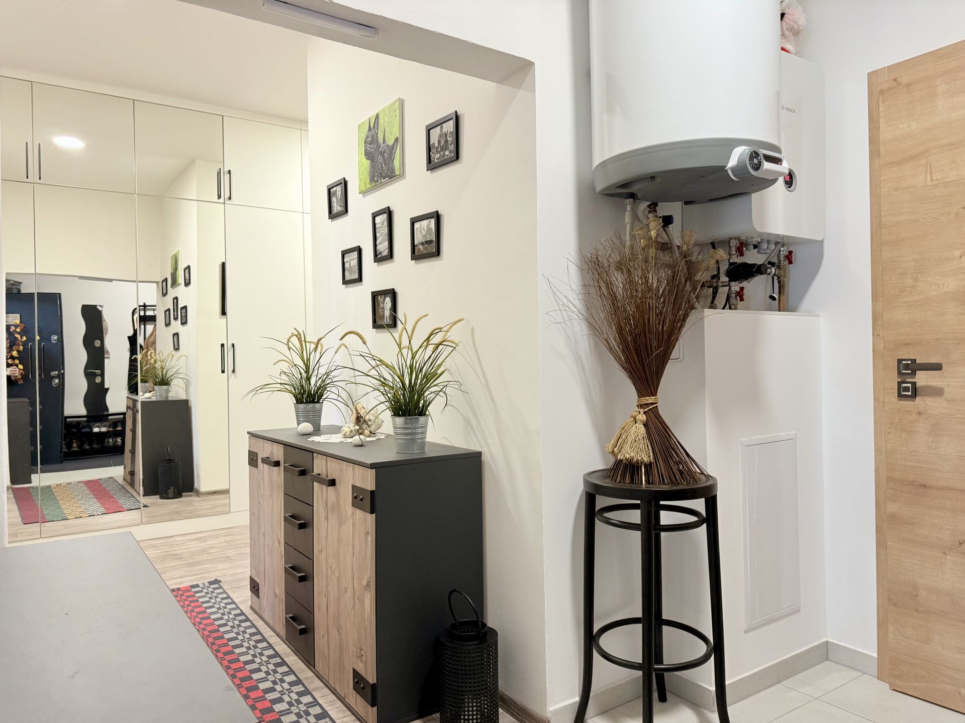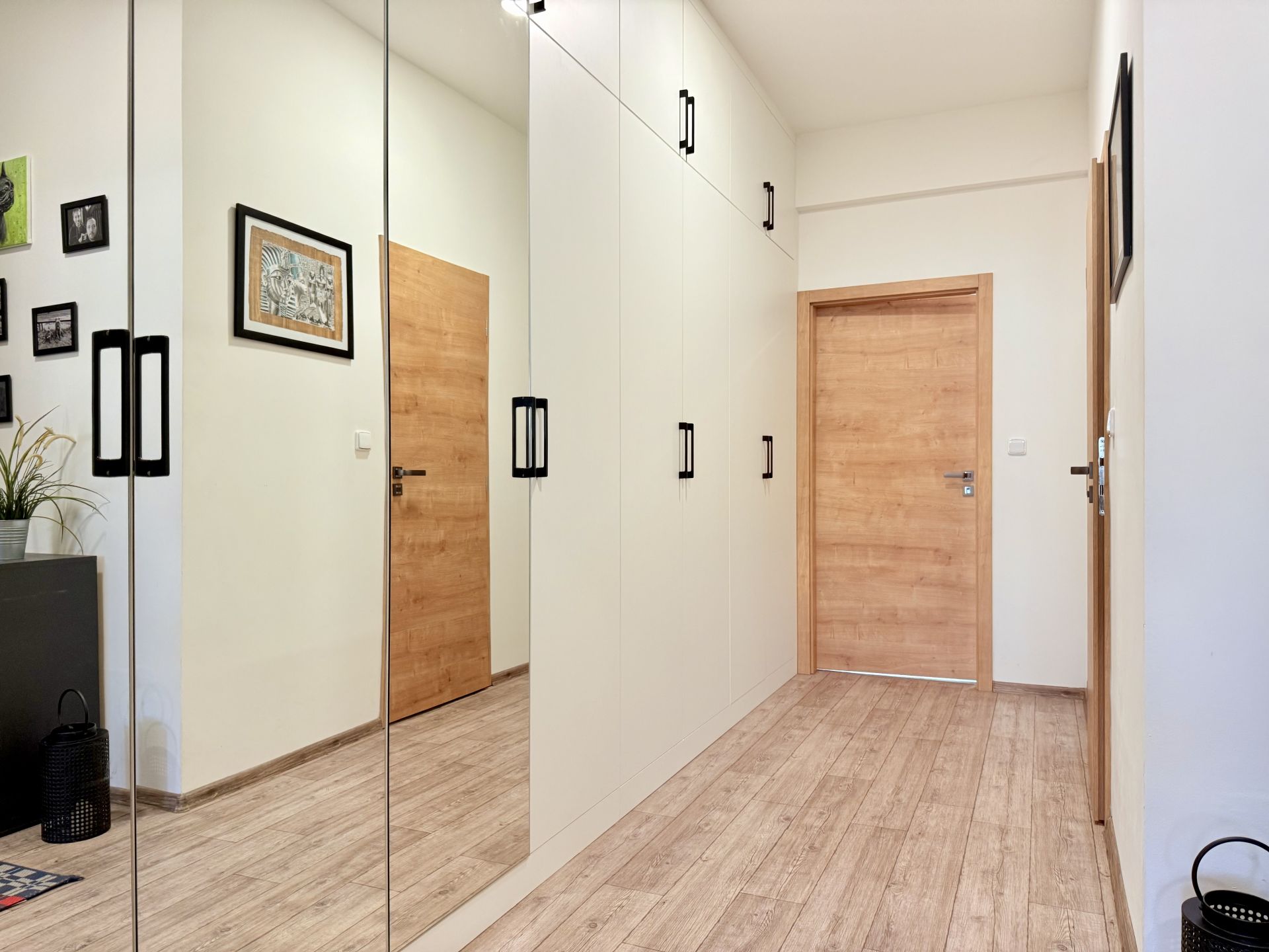 Užitná plocha bytu činí komfortních 70 m². Po vstupu do bytu vás přivítá menší předsíň plynule navazující na chodbu propojující všechny místnosti – koupelnu, samostatnou toaletu, ložnici a obývací pokoj s kuchyňským koutem. V chodbě jsou instalovány kvalitní vestavné skříně až ke stropu, které poskytují opravdu velkorysý úložný prostor a zároveň nenarušují vzdušnost bytu. Dispozice působí velmi čistě a logicky – vše má své místo, nic nepůsobí stísněně. Podlahy jsou řešeny vinylem v kombinaci s dlažbou. Koupelna i toaleta jsou samostatně, což zvyšuje komfort každodenního užívání. Vybavení kuchyně vestavěnými spotřebiči je kompletní.