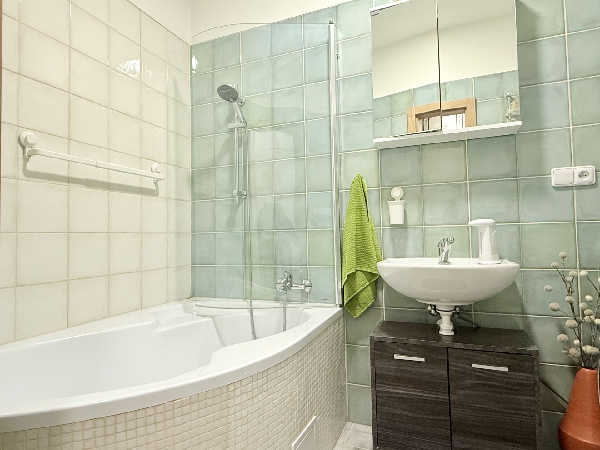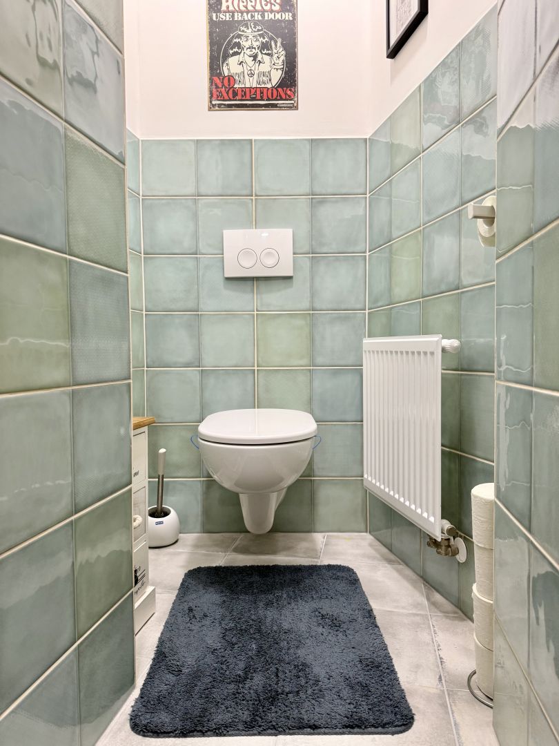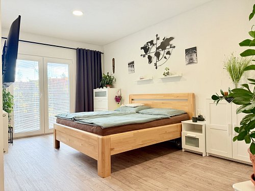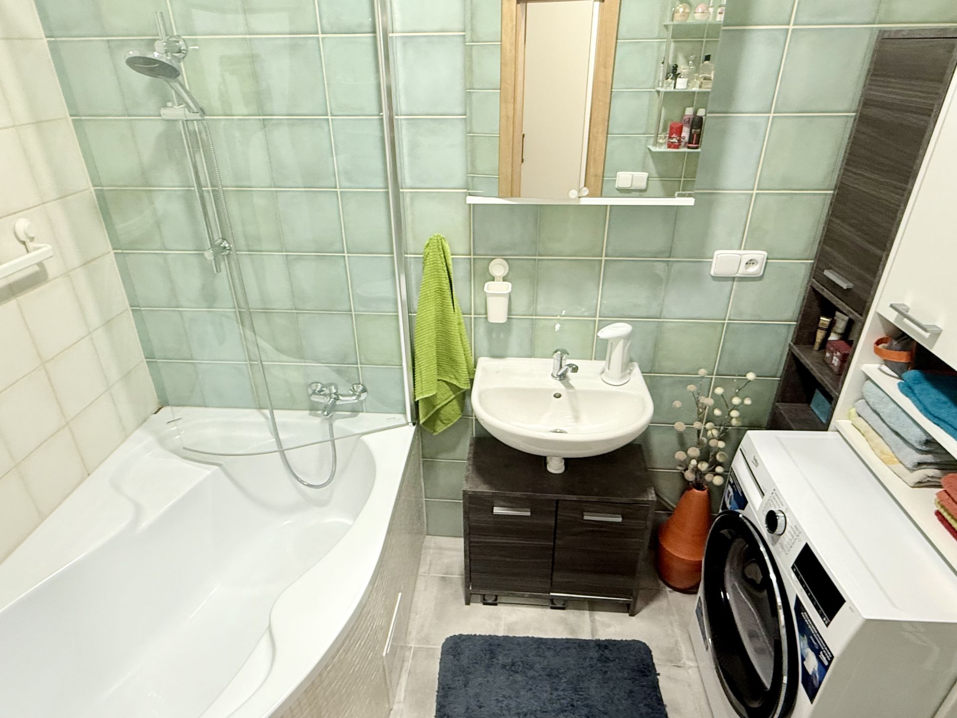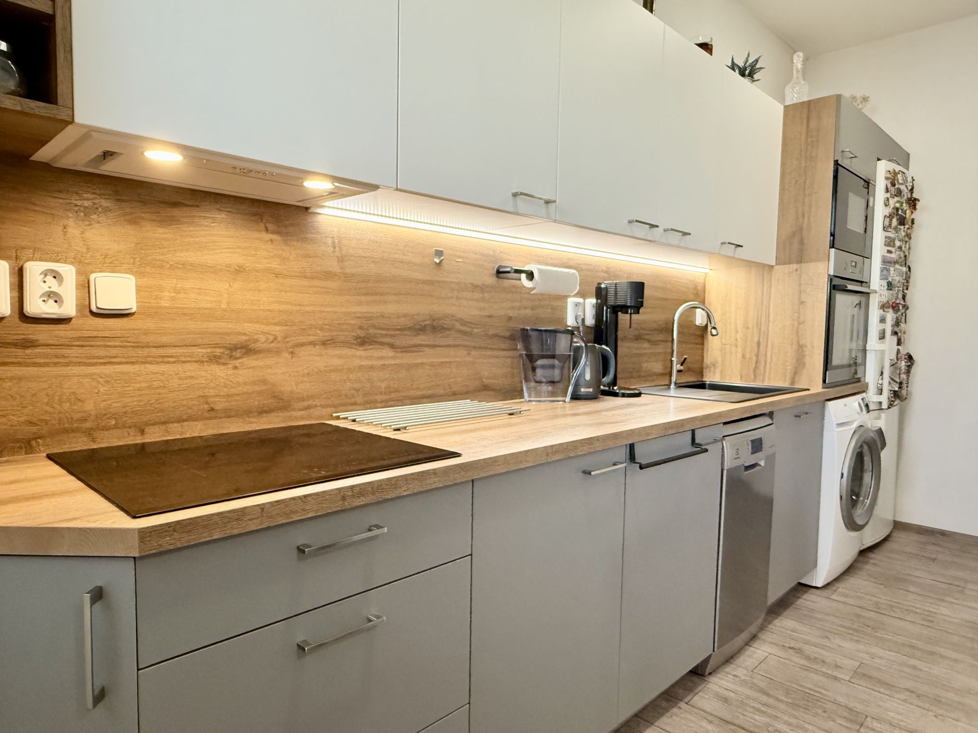 Užitná plocha bytu činí komfortních 70 m². Po vstupu do bytu vás přivítá menší předsíň plynule navazující na chodbu propojující všechny místnosti – koupelnu, samostatnou toaletu, ložnici a obývací pokoj s kuchyňským koutem. V chodbě jsou instalovány kvalitní vestavné skříně až ke stropu, které poskytují opravdu velkorysý úložný prostor a zároveň nenarušují vzdušnost bytu. Dispozice působí velmi čistě a logicky – vše má své místo, nic nepůsobí stísněně. Podlahy jsou řešeny vinylem v kombinaci s dlažbou. Koupelna i toaleta jsou samostatně, což zvyšuje komfort každodenního užívání. Vybavení kuchyně vestavěnými spotřebiči je kompletní.
